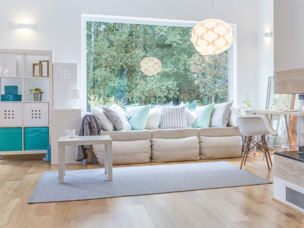 Wooden white coffee table and comfortable sofa in lounge